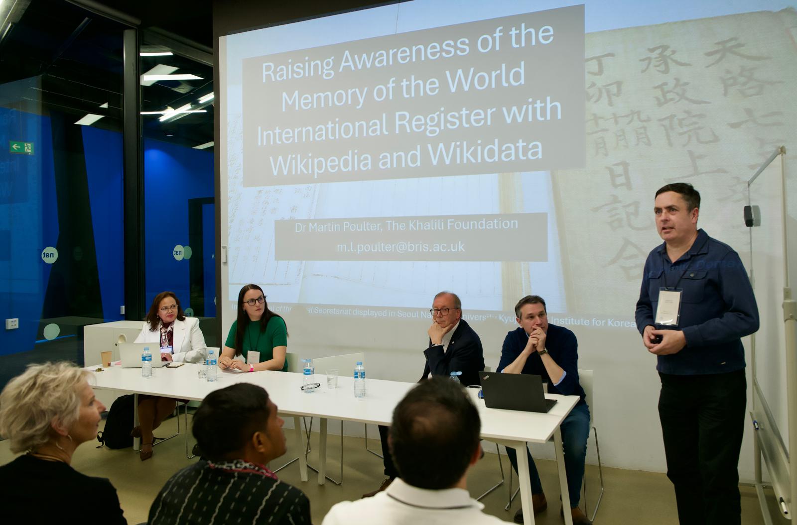 In a panel of four speakers, Dr Martin Poulter, the Foundation’s Wikimedian In Residence described the Foundation’s work to make the Memory of the World International Register visible to new audiences. He explained the functions of the Wikimedia sites in preserving documentary heritage for the long term: Wikimedia Commons for digital media and their descriptions, Wikisource for transcribed text, Wikipedia for contextual articles and Wikidata to connect all these resources in a form that can be used by machines. Through these platforms, the Memory of the World inscriptions are reaching an enormous audience: roughly 100 million image views for the month of September.